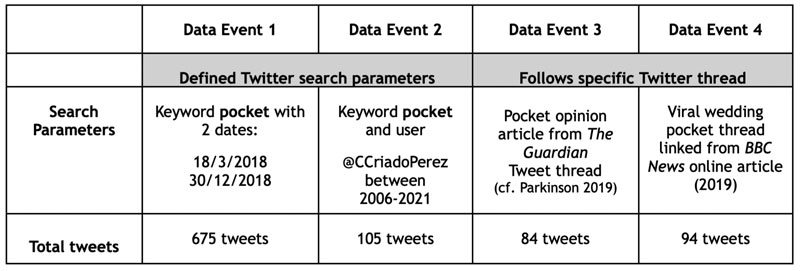 The pocket meme examples discussed in this article are drawn from a corpus compiled during my PhD research at Manchester Metropolitan University. To determine an appropriate sample size, I applied the concept of information power (Malterud et al. 2016: 1753), a qualitative research framework that prioritises data relevance over quantity. This approach enabled the selection of data that closely aligns with the research aim, capturing specific moments in time related to the gendered experience of pockets. The data set comprises four distinct data events: Two involve keyword searches for pocket combined with either specific dates or particular Twitter users; the other two focus on tracing specific Twitter threads. These are summarised in Figure 1. As introduced above, a social listening approach was adopted, which allows researchers to attend to all forms of participation in digital spaces, including those often considered passive, such as lurking or silent observation. As Adjin-Tettley and Garman note, such participants often remain invisible in traditional analyses, despite their engagement being meaningful and worthy of attention (cf. Adjin-Tettley/Garman 2023: 12).