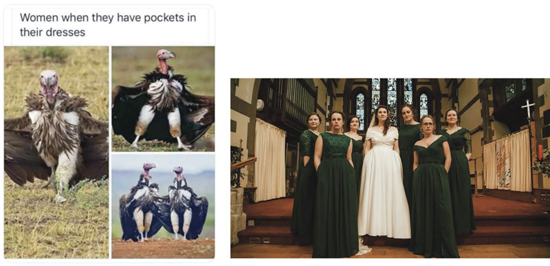 Fig. 4: Vulture Pockets Meme, sourced https://cheezburger.com/9631749/fourteen-oddly-specific-memes-about-pockets, vs. Wedding Pocket pose, sourced: with kind permission from oakandblossom.com