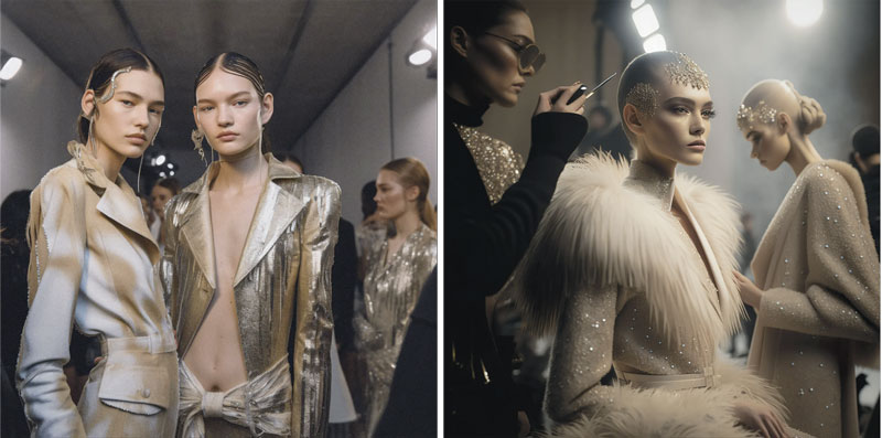 Fig. 3: AI-generated behind-the-scenes images from AI Fashion Week 2023 by Anya Klyueva and Gaby Roses, created with Midjourney..